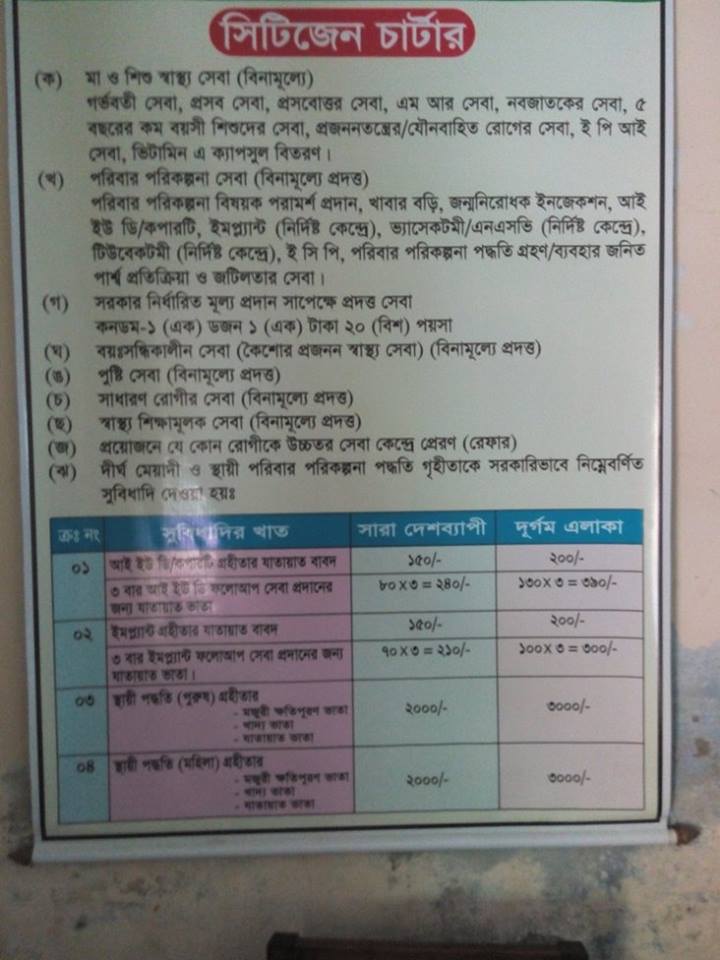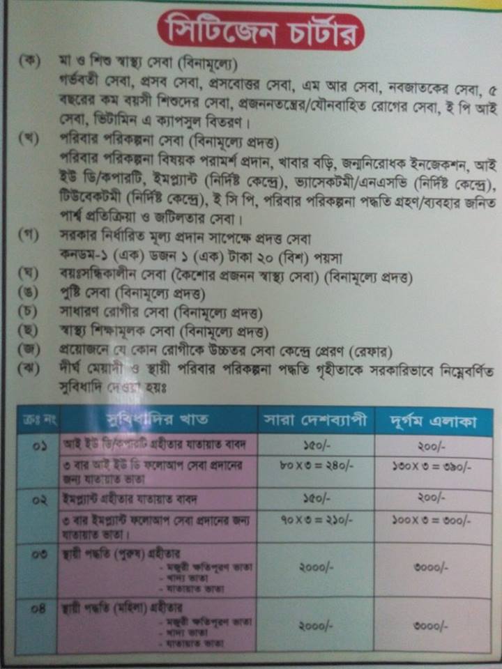 ঘ) পরিবার পরিকল্পনা কার্যক্রমে সরকার গ্রহীতাকে নিম্নলিখিত সুবিধা দিয়ে থাকেঃ ক্রমিক প্রদেয় সেবা/কাজের নাম ও স্থান সংশ্লিষ্ট বিধি বিধান সেবা প্রদানের সময়সীমা সেবা প্রদানকারীগণের নাম ও পদবী ০১ আই,ইউ,ডি/কপারটি এর ক্ষেত্রে ১৫০+২৪০=৩৯০/- গ্রহিতাকে প্রদান করা হয়